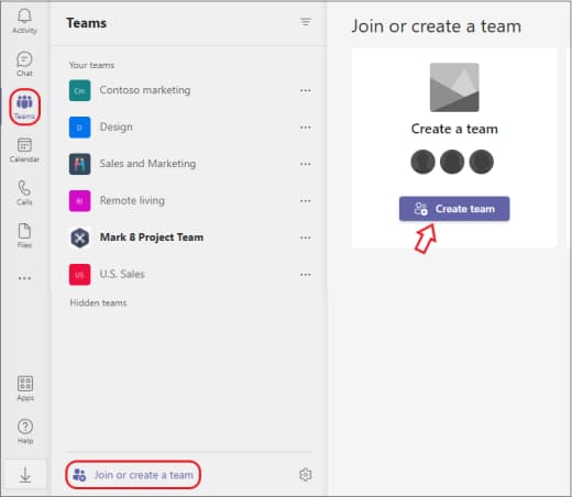 - In Teams, go to (all) Teams -> ‘Join or Create a Team’ ->