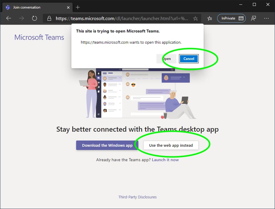 To use Teams in the browser, click ‘cancel’ and ‘use the web app instead’
