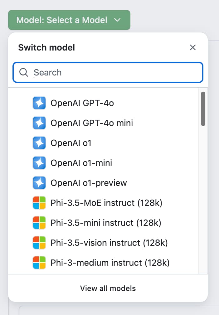- GitHub Models: A feature that brings powerful AI models like GPT-4o, Llama 3.1, Phi-3, and Mistral directly available in your GitHub project.