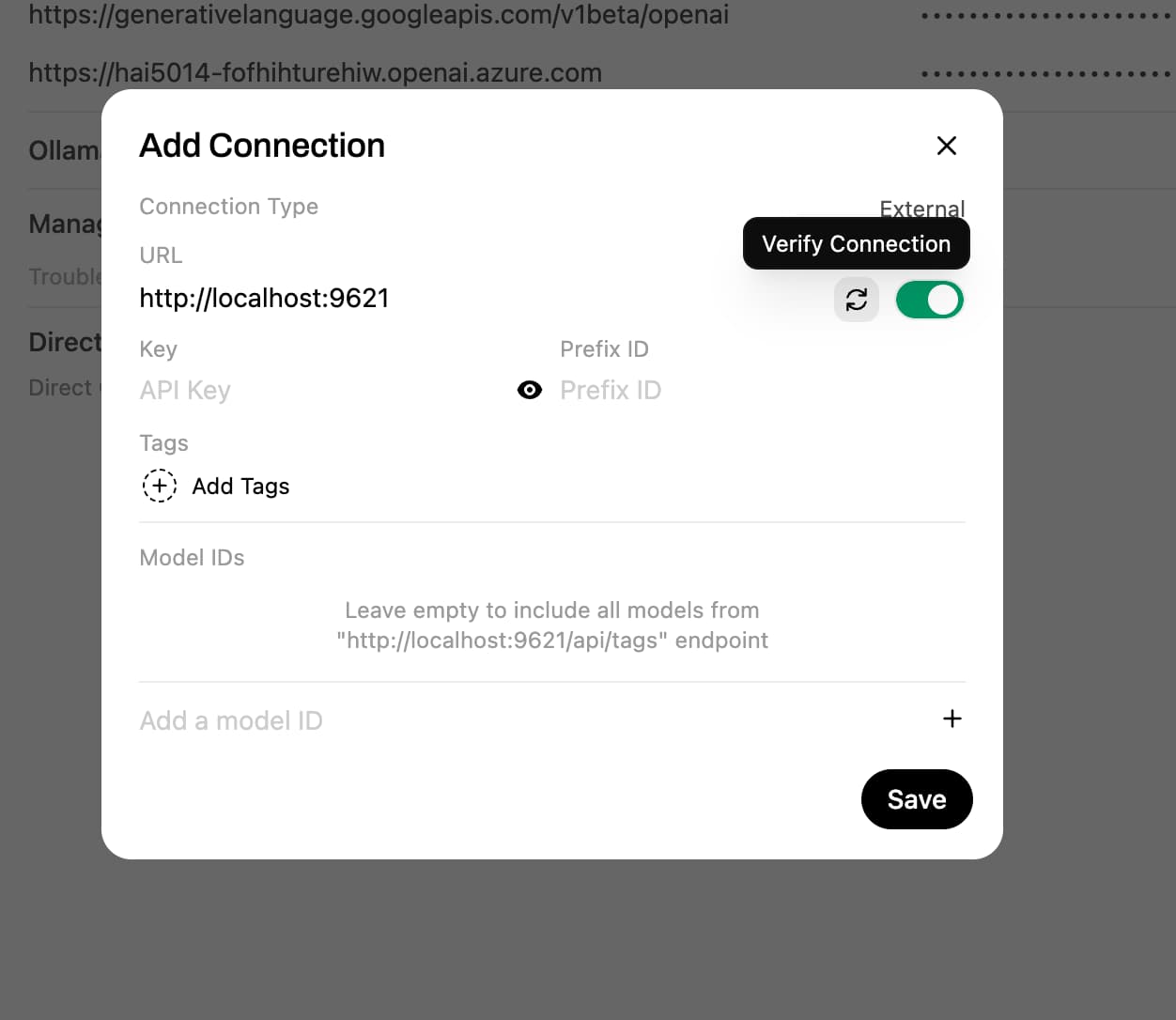 +button behind theManage Ollama API Connectionslabel - In the URL field, enter