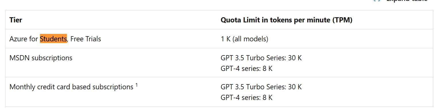 During a recent class I found that Microsoft has put a 1000 token per minute quota for Azure for Student subscriptions. Azure OpenAI Service quotas and limits
