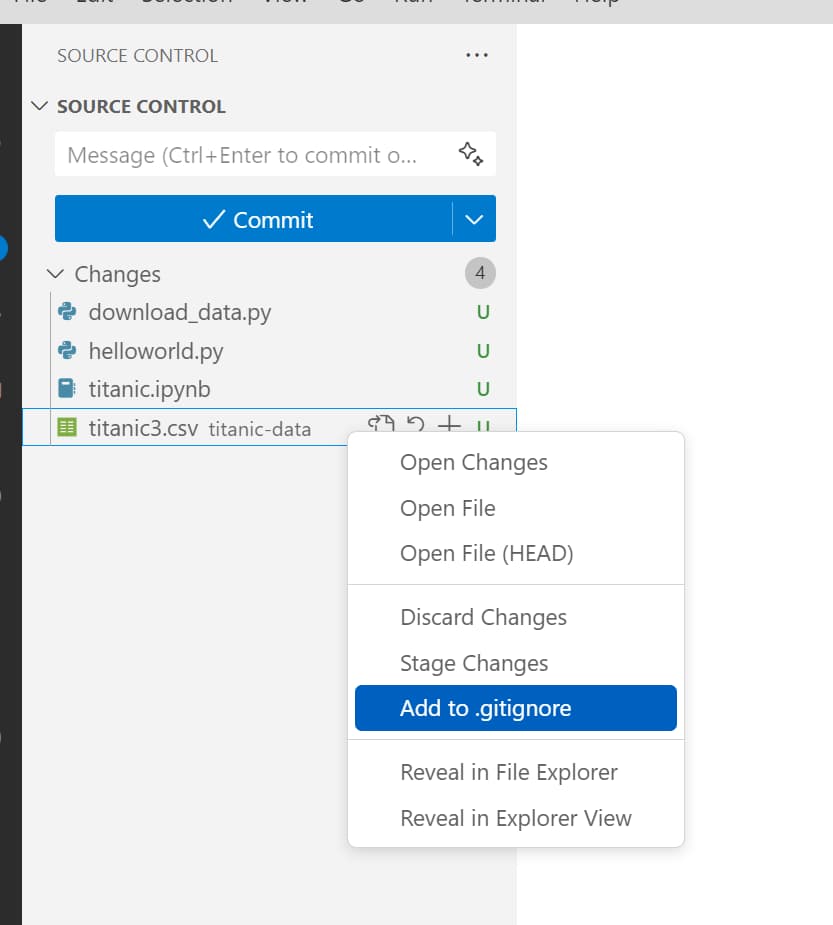 titanic3.csvand click ‘Add to .gitignore’. Then, check out the newly created.gitignorefile. Type