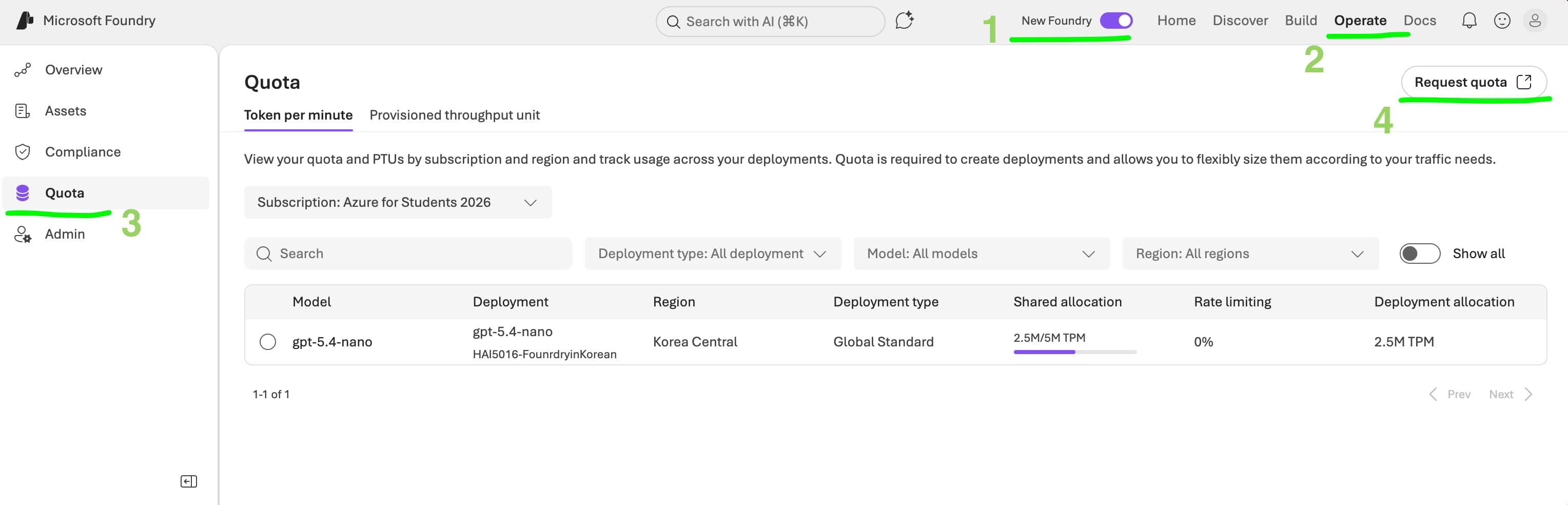 Because it seems that student subscriptions have limited deployment options by default, we have to request for Quota Increase in order to use the OpenAI (or Anthropic) models that I have planned to use in the exercises. The quota request process can take up to 24-48 hours, so make sure to do this as soon as possible.