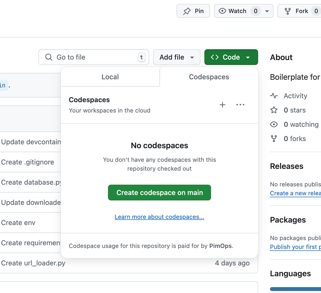 For the sake of time, I have prepared a boiler plate repository that contains some files and folders to quickly set up our developer environment. We will fork this repository to our own GitHub account and then create a codespace from it to develop our chatbot.