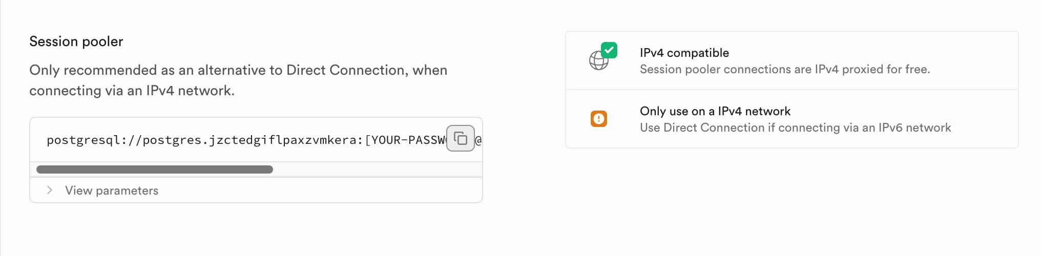 [YOUR-PASSWORD]part of the connectionstring with the password of your Supabase databaseIf you forgot your password, you can reset it by going to the project settings > Database > Reset database password