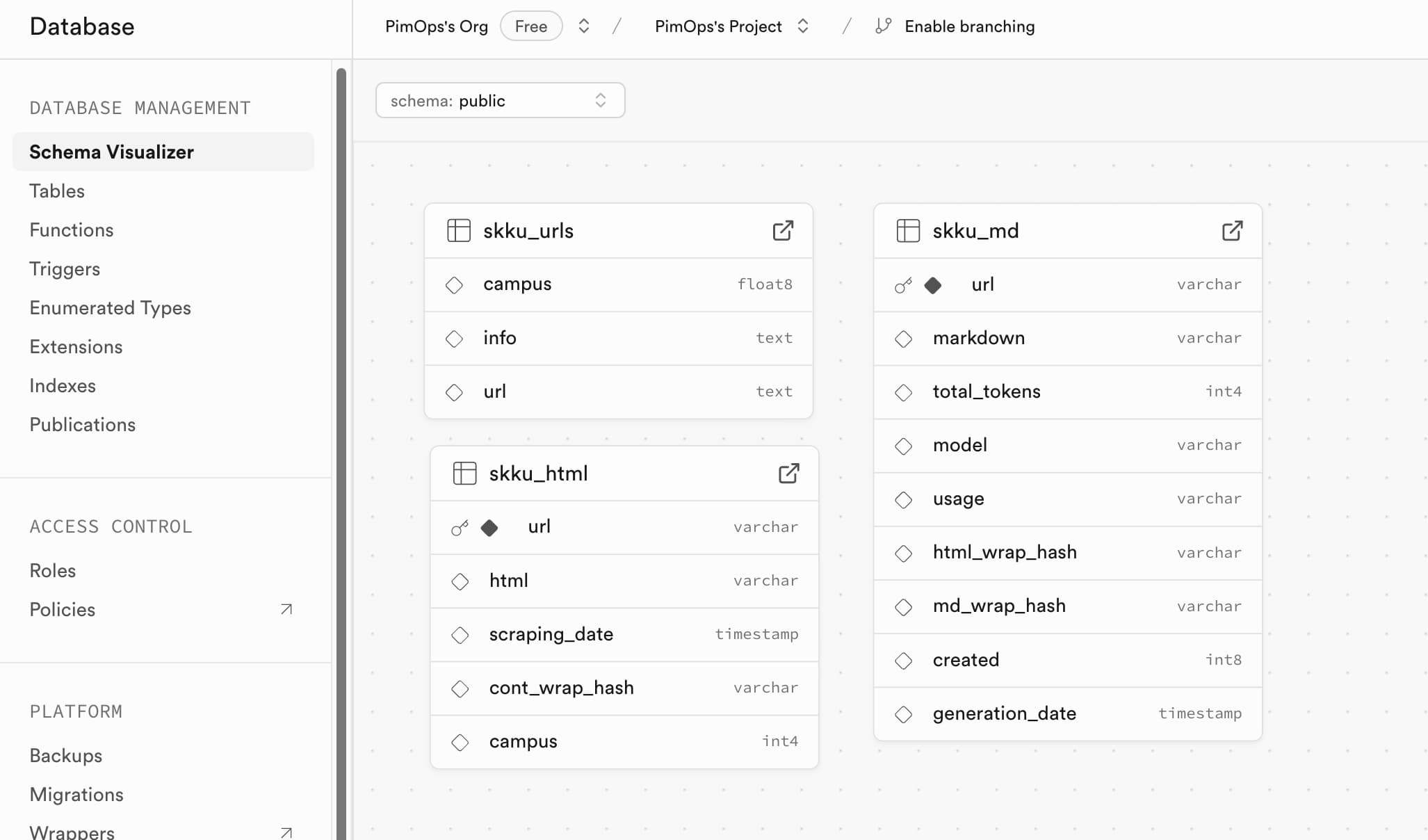 Although this is not best practice, but because I made some changes in the skkuMd class in our code, we are going to delete the skku_md table in the Supabase database. In this table we are going to store the markdown files parsed from the HTML that we have scraped from the SKKU website.
