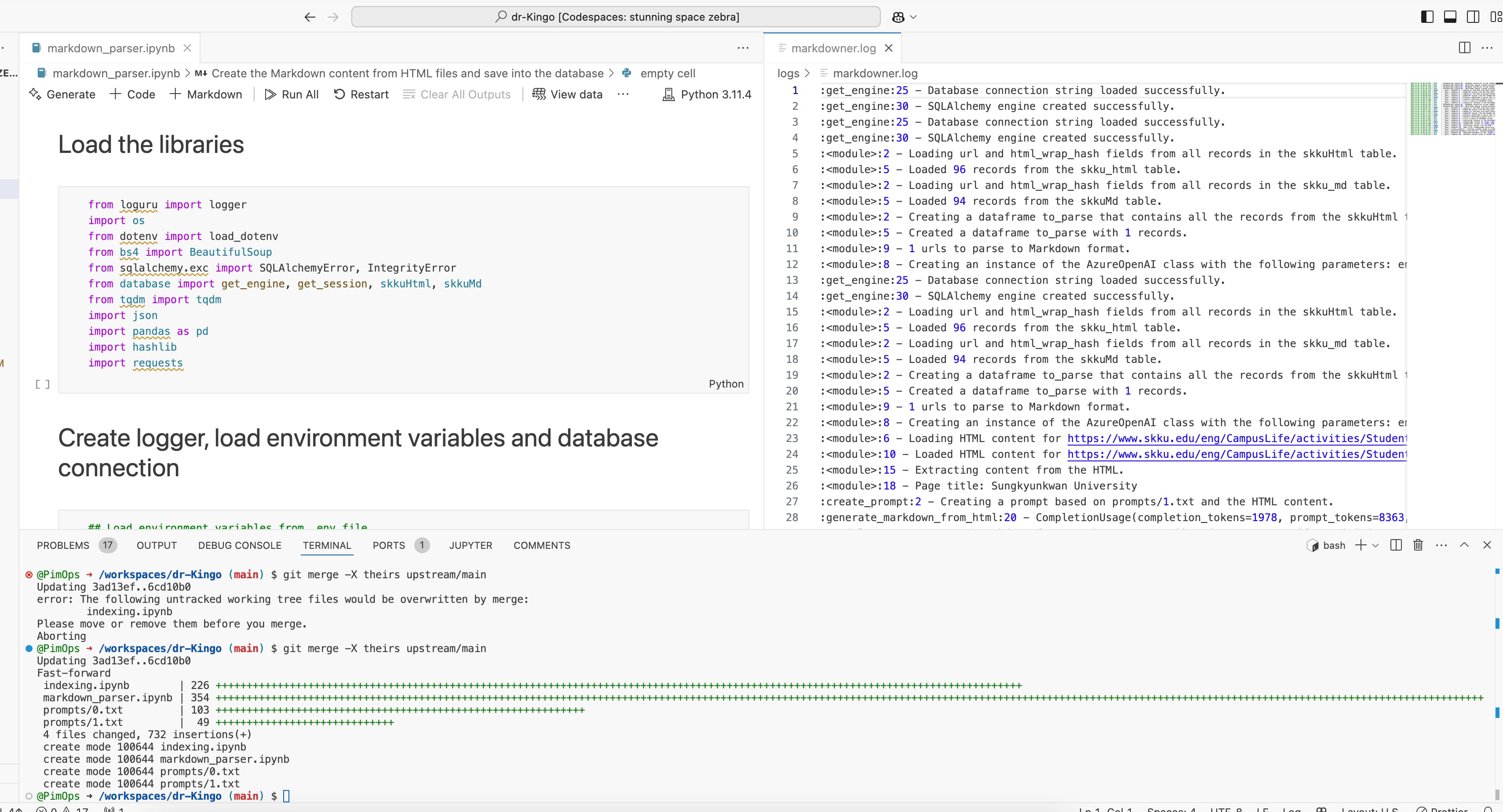 The markdown_parser.ipynb notebook will parse the HTML files that we have scraped from the SKKU website and convert them into Markdown format. Then, the script will save the parsed markdown files into the skku_md table in our Supabase database.