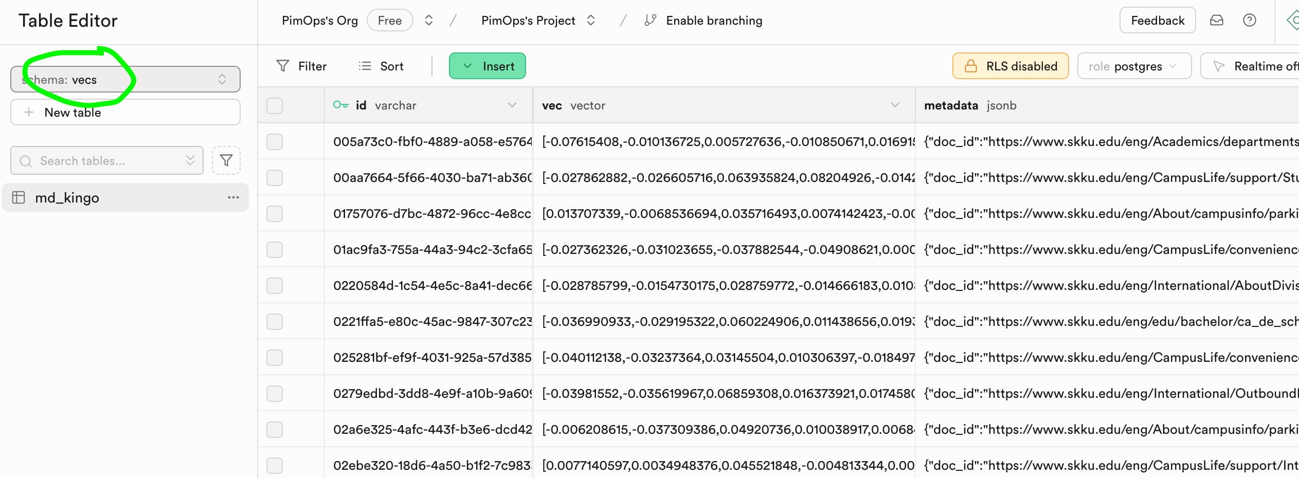 After the indexing is done, we can check the vector store in the Supabase dashboard. In the left navigation bar, click on Table Editor and find the vecs schema. Here you can see the md_kingo table that contains the embeddings for the nodes of our markdown files.