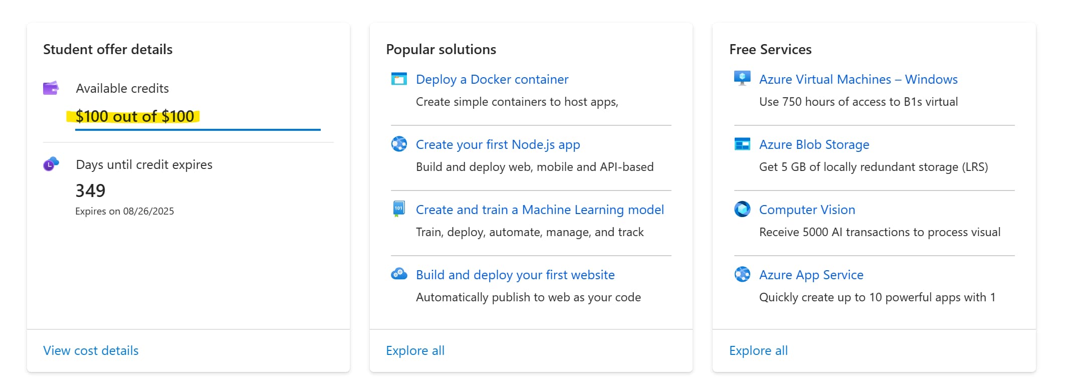 - Use your university or school email to sign up via https://azure.microsoft.com/free/students
