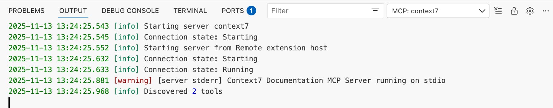 This should open the output tab in your VS Code window, showing that the Context7 MCP server is starting up and discovered (at least) 2 tools.