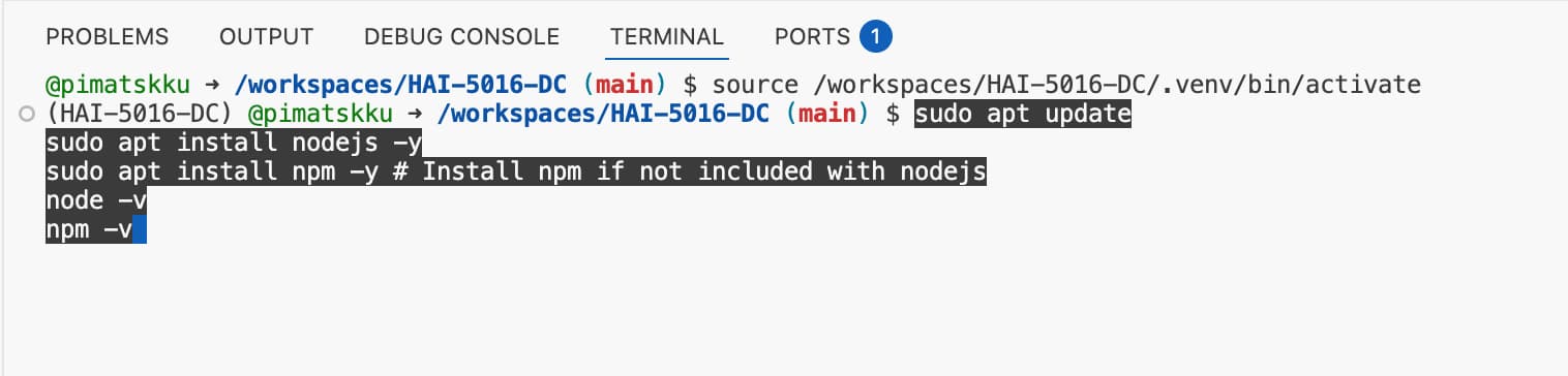 1. Install nodejs and npm in your codespace (dev container)