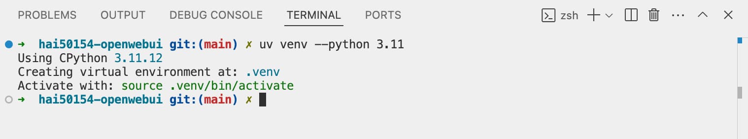After the installation, close your current terminal and reopen the terminal in the root of the repository and run the following command to create a new Python virtual environment: